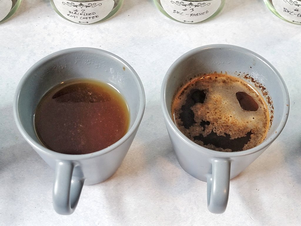 The unroasted koji-blackened grounds sunk almost immediately with no crema, and the color is very light. The roasted version looked right and was even slightly darker in color than the regular (not blackened) roasted beans.