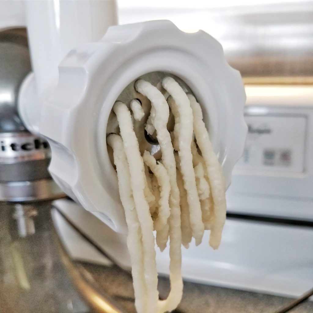 The koji rice and cooked rice were mixed as best as I could (I should have also added the salt here but forgot). To get the smooth paste look like the Instagram post, I decided to put it through the meat grinder attachment of my stand mixer. I still did not quite achieve the smooth texture of the photo, but that may come with time as the koji rice grains break down.