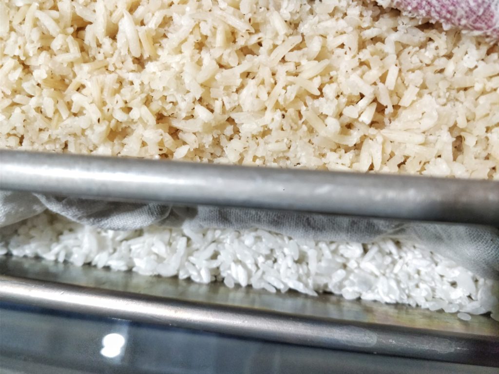 At 20 hours in, the temperature of the rice had increased to 90°F. I reduced the temperature on the circulator to 86°F and cracked the lid open. I could already see some growth on the control batch, but not on the toasted rice.