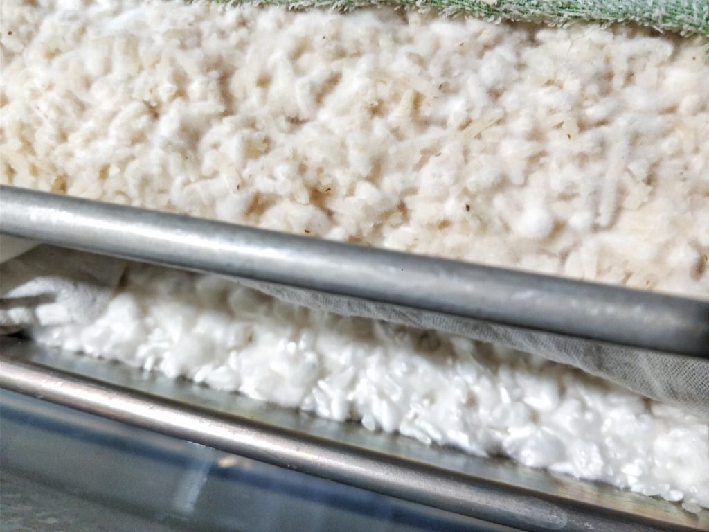 I dusted the cooled cooked rice with 10g of dispersed spores in sterilized rice flour, which contains about 1g of spores total. This is the standard amount I use for all of my 1kg batches of koji rice.