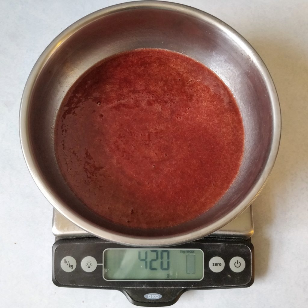 You can absolutely begin your jam-making with just the lightly-blended berry mix, but I’m not really into chunky jam. Skins I can do without, and seeds I find annoying. So I put it through my OXO food mill. I have to say, I was a bit disappointed with the amount of raspberry seeds that got through my mill, so I also put it through a fine mesh strainer. That did the trick, and I was left with 420g of pulpy fruit juice.